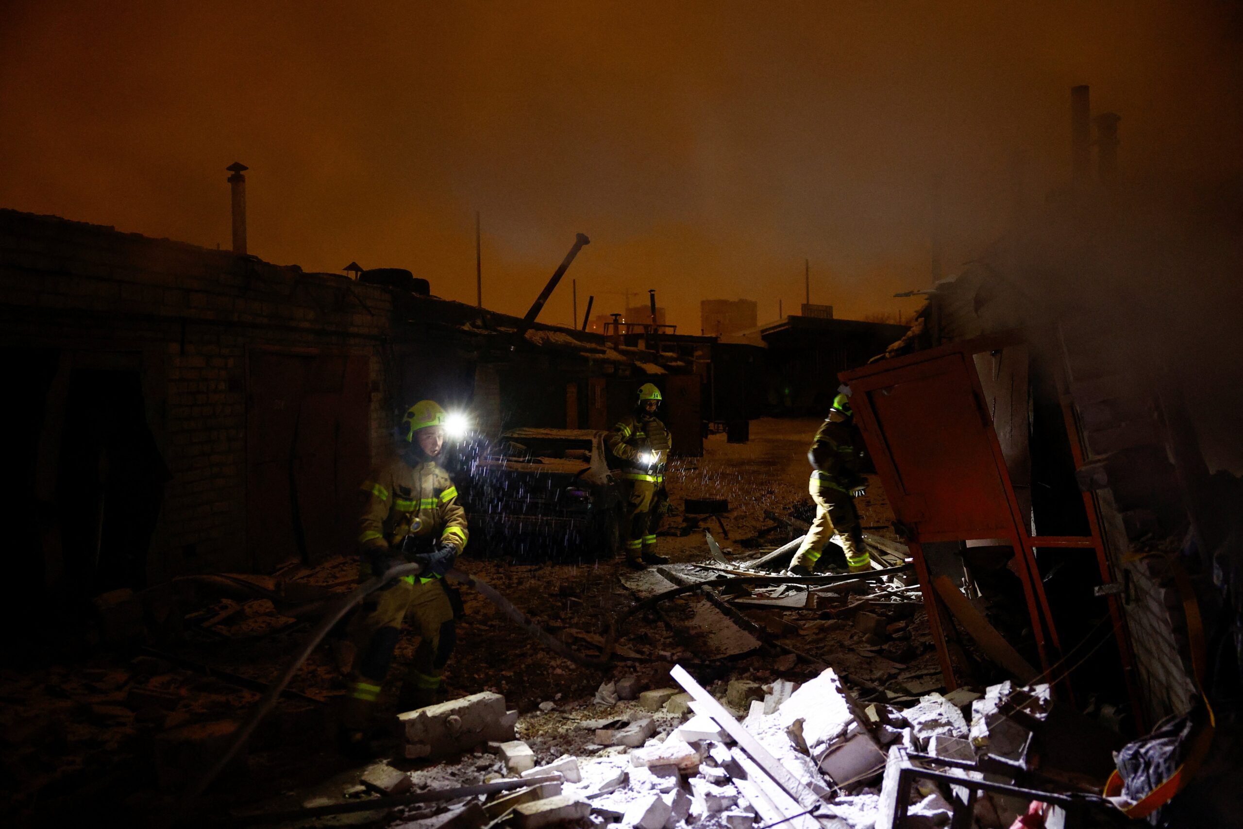 Bombeiros trabalham em um complexo de garagens danificado durante um ataque russo com drones e mísseis, em meio ao ataque da Rússia à Ucrânia, em Kiev, Ucrânia, 9 de janeiro de 2026