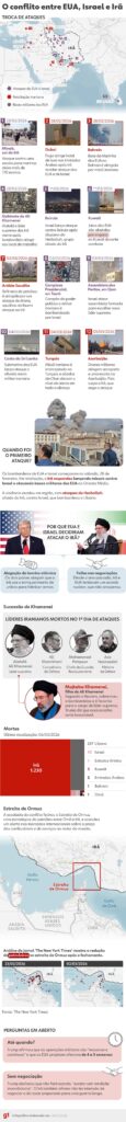 Editoria de Arte/g1 A guerra no Oriente Médio completou uma semana sem sinal de qualquer negociação por cessar-fogo. Os ataques de EUA e Israel mataram no último sábado (28) o líder supremo do Irã, aiatolá Ali Khamenei, e chefes militares do regime iraniano. Em retaliação, o Irã lançou drones e mísseis contra Israel e contra […]