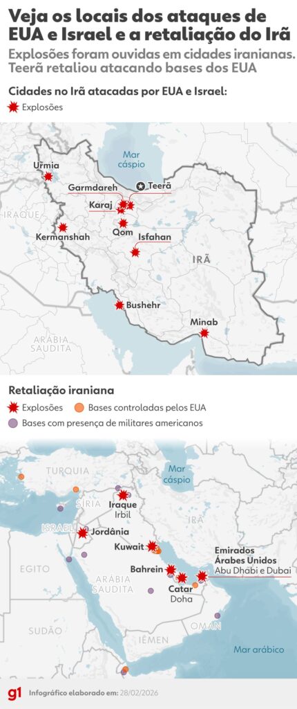 EUA e Israel bombardeiam o Irã, que ataca bases americanas em resposta Trump anunciou ‘grande operação de combate’ e disse que objetivo é ‘defender o povo americano’ de ameaças. Irã lançou ataques contra Israel e bases americanas na região, incluindo Catar, Kuwait e Emirados Árabes. Os EUA atacaram o Irã, em uma ação coordenada com […]