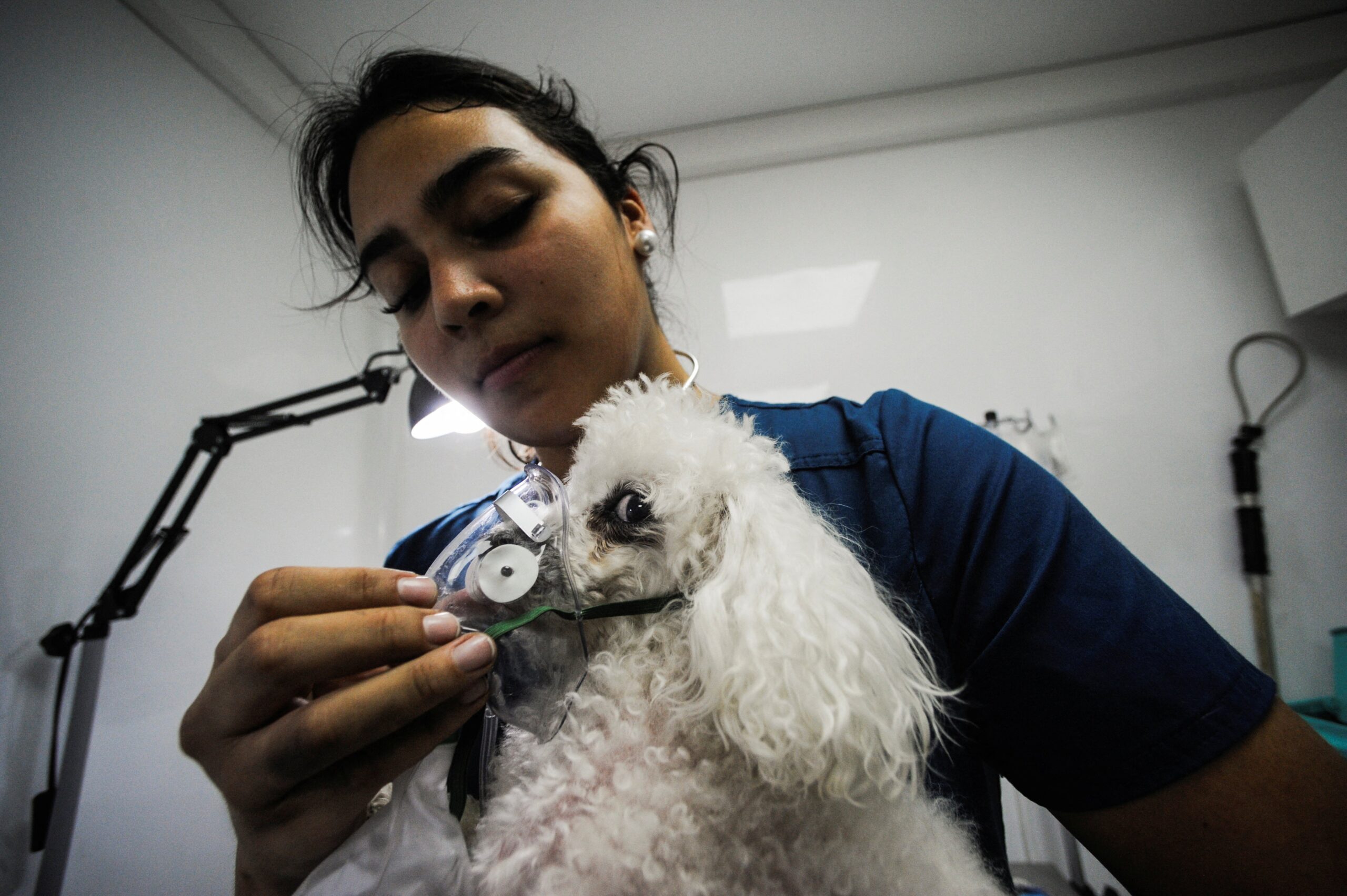 Veterinária atende cachorro em uma clínica móvel após um incêndio florestal na região de Biobío, no Chile