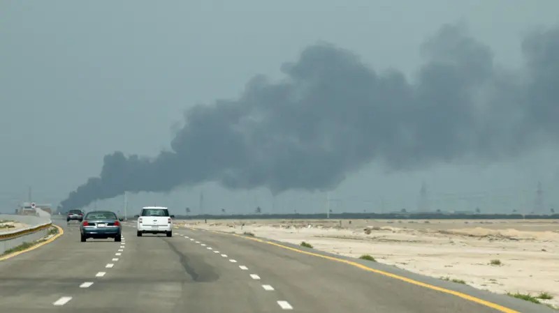 Fumaça sobe da refinaria de petróleo Ras Tanura na Arábia Saudita, na segunda-feira (2/3), após um ataque de drone iraniano.