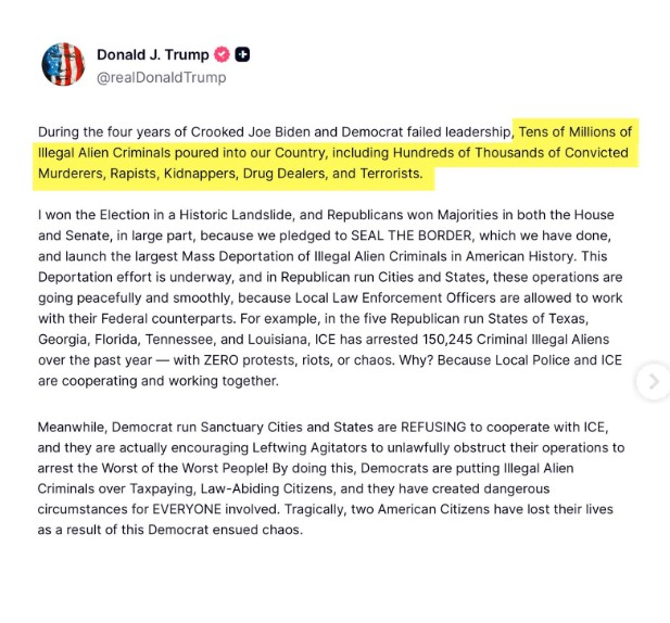 No post, Trump afirma que, durante o governo do ex-presidente Joe Biden, dezenas de milhares de imigrantes ilegais entraram nos Estados Unidos, incluindo condenados por assassinato, estupro, sequestro, terrorismo e trafico.